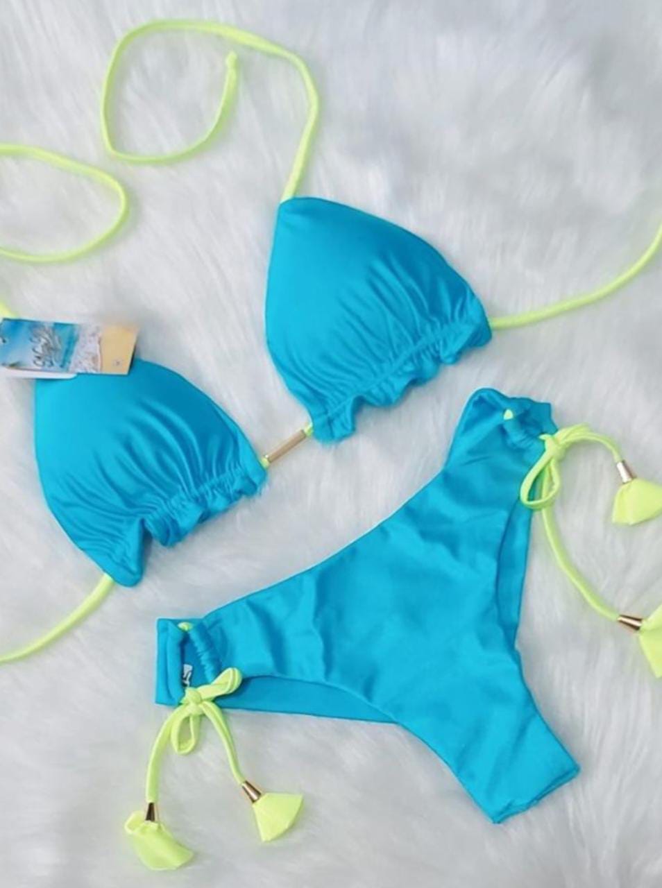 Biquini Cortininha Com Calcinha Fio Duplo, Trilobal Azul/Amarelo